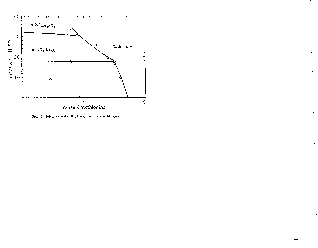 The same group of investigators also presented some information on the NH4H2PO4-methionine-H2O system.3 The phase diagrams for the systems, Fig. 14 and Fig. 15, provide an illustration of the problem involved in the so-called α- and β-NH4H2PO4 discussed on page 1335. The authors are convinced that these two allotropes do exist and state that the transition point between them is at about 306 K. However, the evidence for these claims appears to be weak. There is no clear break where the curves for those systems in which both these solid allotropes are in equilibrium with the saturated solution join the curves for solutions in which the organic component is also an equilibrium solid phase. Furthermore, there is an insufficient number of data points for solutions in equilibrium with both the solid a-NH4H2PO4 and b-NH4H2PO4.
