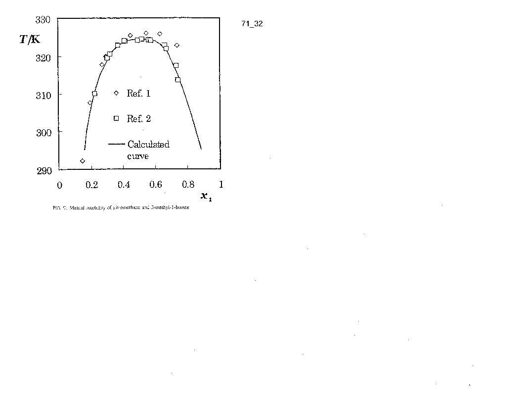 The UCST = 324.5 K and xc1 = 0.520, reported in Riccardi et al.,2 may be treated as tentative and these values have been used also for approximation. In the opinion of the evaluators, the mutual solubilities calculated by this equation may be treated as tentative. The results of calculations for the selected temperatures are presented in the following table. This relationship together with all experimental points1,2 are also presented in Fig. 9 .