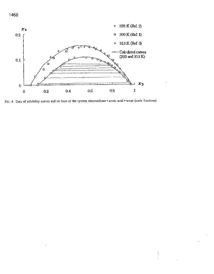 The system nitromethane + acetic acid + water forms a miscibility gap of Type I, Treybal.4 Only one binary pair of components, nitromethane + water, is partially miscible. The data for this system were previously compiled and critically evaluated.5 The recommended values for the solubility of nitromethane in water at 293.2 K is x1" = 0.0345; and at 313.2 K, x1" = 0.0426. The solubility of nitromethane in water at 293.2 K reported in Maslovskaya and Zhuravlev2 (0.0900 mass fraction; 0. 0284 mole fraction) and at 313.2 K in Maslovskaya3 (0.1000 mass fraction; 0.0318 mole fraction) are rejected because they are inconsistent with recommended values.5