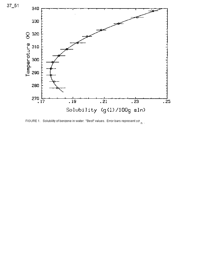 Table 2. Recommended (R) and Tentative Values of the Solubility of Benzene (1) in Water (2)| T/K | T/KNote | Reference | Sol. Power | Solubility | Solx10(**) | Sol. Note | Best Solubility | Best Sol. Note | x1 Power | x1 | x1 Note |