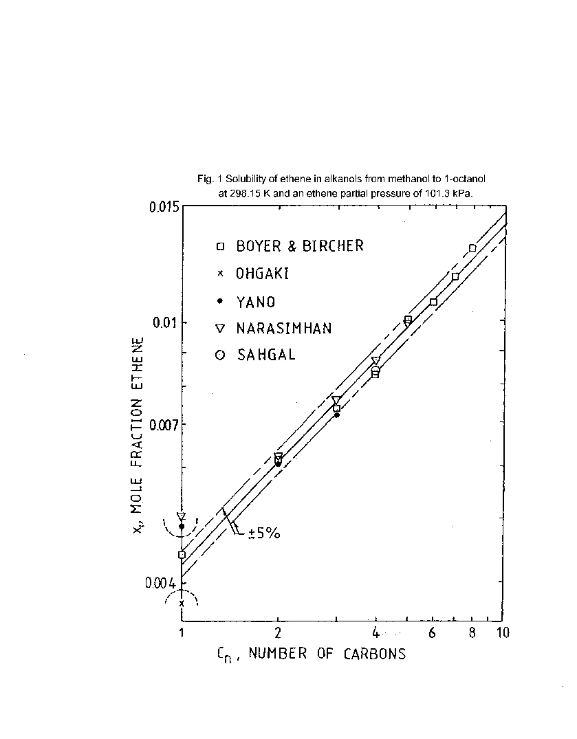 . The resulting linear relation for the solubility of ethene in the alkanols for a gas partial pressure of 101.3 kPa and a temperature of 298.15 K, excluding the data outside the 5% range mentioned above, and expressed in two ways is: