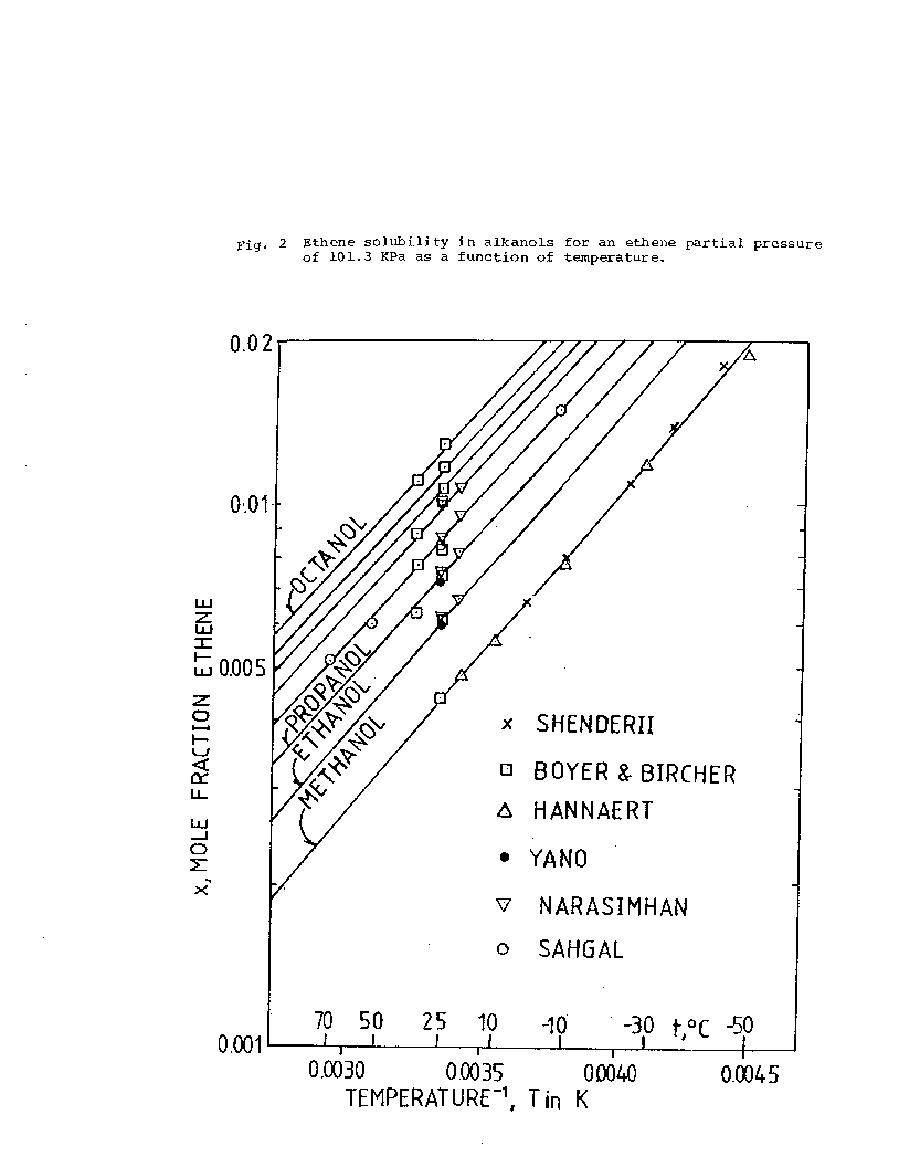 . Only three research groups reported ethene solubility in more than one alkanol solvent. Boyer and Bircher