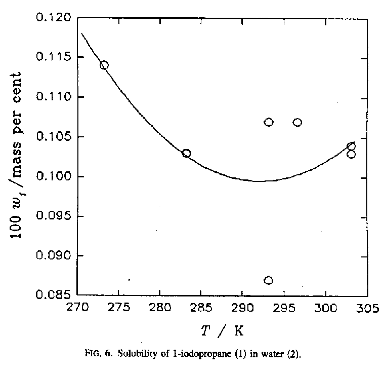 All the available data for the solubility of 1-iodopropane (1) in water (2) were combined and correlated to obtain the following mass percent (1) equation: