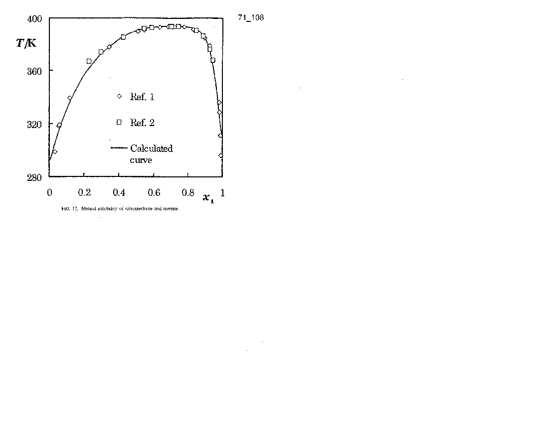 The upper critical solution temperature has been reported as 393.45 K (Malesinska1) and 393.8 K (Rolla et al.2). Thus, the recommended value is (393.6 ± 0.2) K. The corresponding critical solution composition has been reported as xc1 = 0.695 (Rolla et al.2) and xc1 = 0.720 (Malesinska 1). Their average, xc1 = 0.708 ± 0.012, is recommended. These recommended values are consistent with the values calculated in the series nitromethane - n -alkane systems and described in the Introduction material to this volume "Relations of Solubility Data in Binary Systems Containing Nitromethane." The numerical values reported in the above table have been approximated by the equation based on scaling law and described also in the above introduction material to this volume. The following parameters have been adjusted: