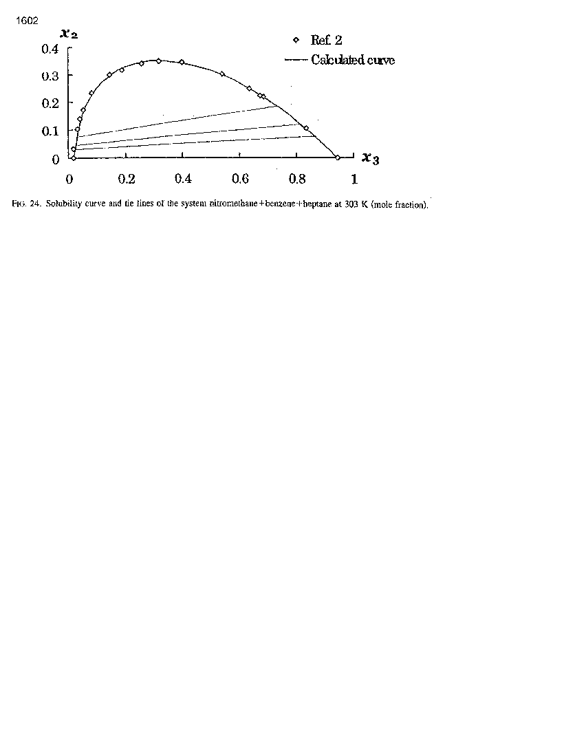 The proposed equation gives a smaller standard deviation than any other tested equations. The equation parameters (a, b, c, d) were calculated by the least squares method: a = 0.6230, b = 0.1190, c = 0.5621 and d = 0.1536; standard deviation of calculated and experimental values is 0.0208 (2.08 %). The binodal curve for this system was calculated and compared to solubility data reported in Kimura et al.2 The solubilities calculated by the proposed equation are presented in Table 2 and Fig. 24 .